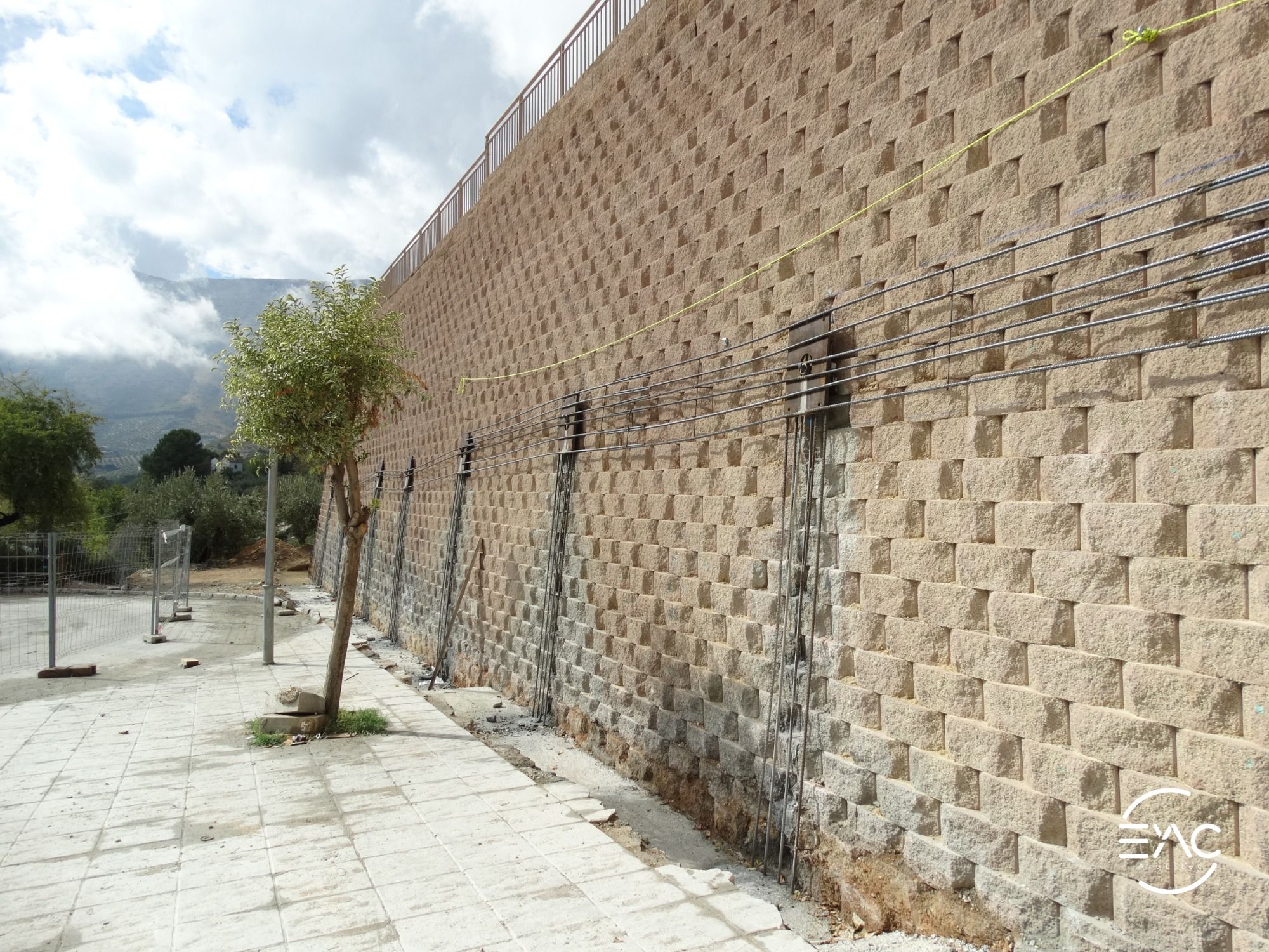 Dentro de las actuaciones recogidas en la intervención SEGUNDO PROYECTO COMPLEMENTARIO de MEDIDAS CORRECTORAS A LOS PROBLEMAS DE INESTABILIDAD DE SUELO DEL ÁREA DE LADERA SITUADA INMEDIATAMENTE SOBRE EL MÓDULO CENTRAL del edificio, se realiza el refuerzo del muro tipo "Keystone" que presenta deformaciones en su plano vertical y rotura de algunas de sus piezas debido en parte a un exceso de altura y por otra a la inadecuación del terreno de su trasdós, que además presenta asientos generalizados que afectan incluso a las redes de alcantarillado, las cuales quedaron fuera de servicio como consecuencia de dichos movimientos.