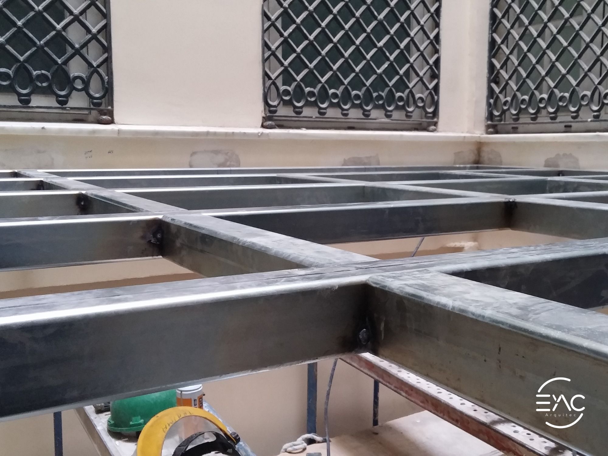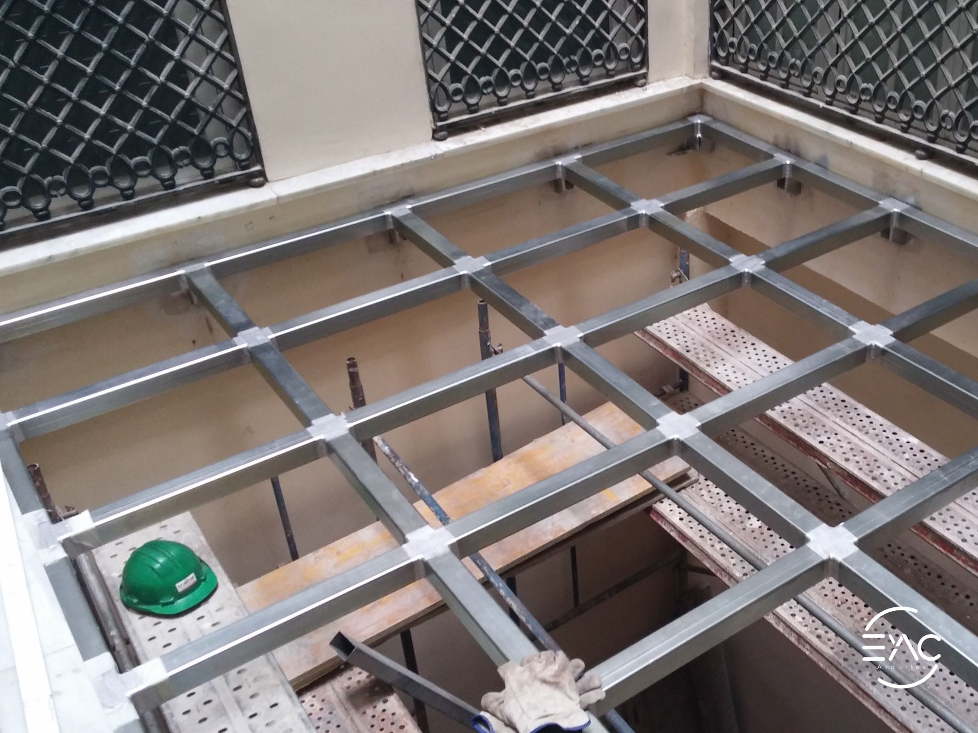 Ejecución de forjado bidireccional postensado con vidrios de seguridad en patio inglés.