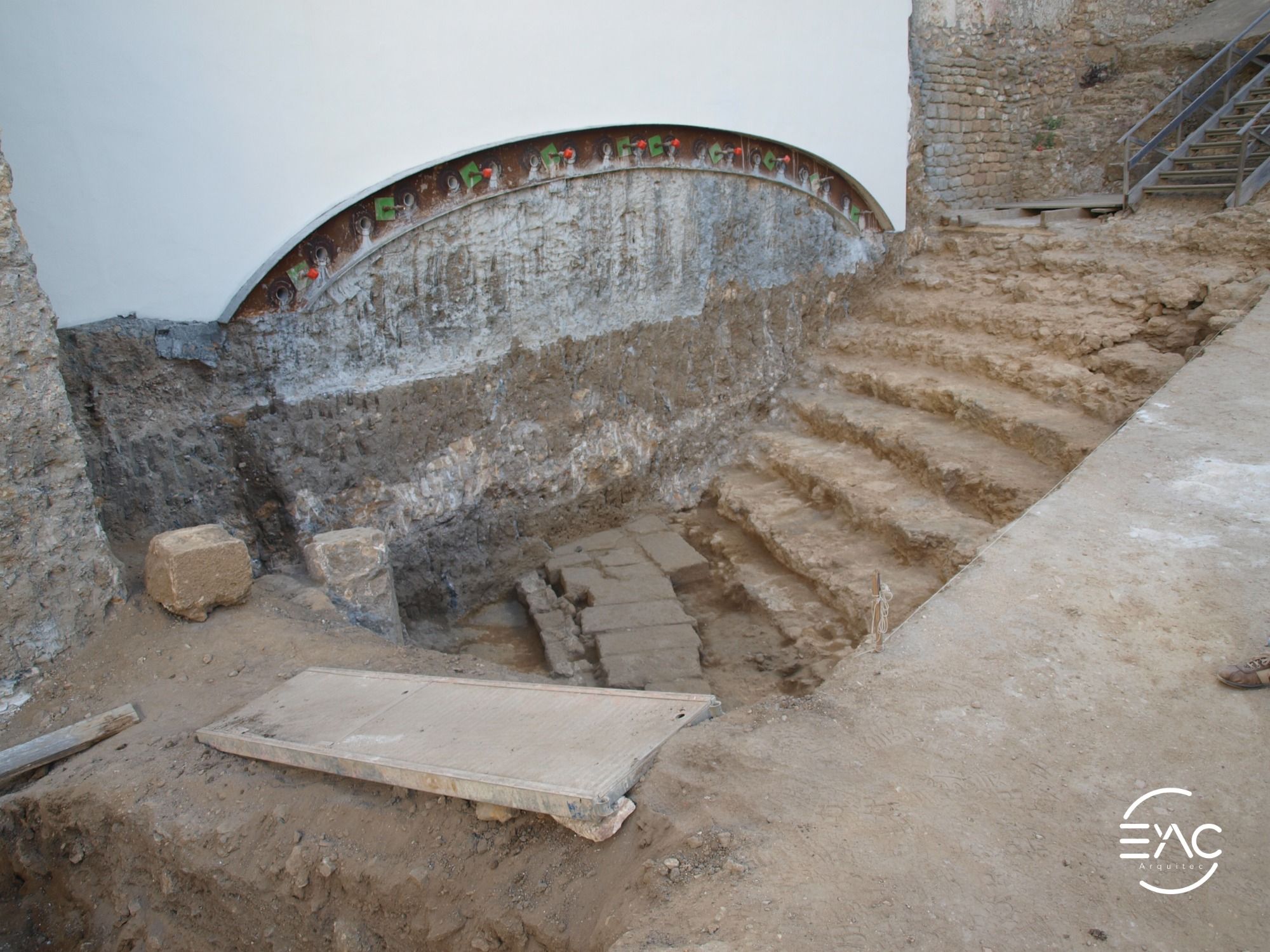 Actuaciones de emergencia para la consolidación parcial de las cimentaciones de los edificios medianeros con el área excavada del teatro romano de Cádiz.